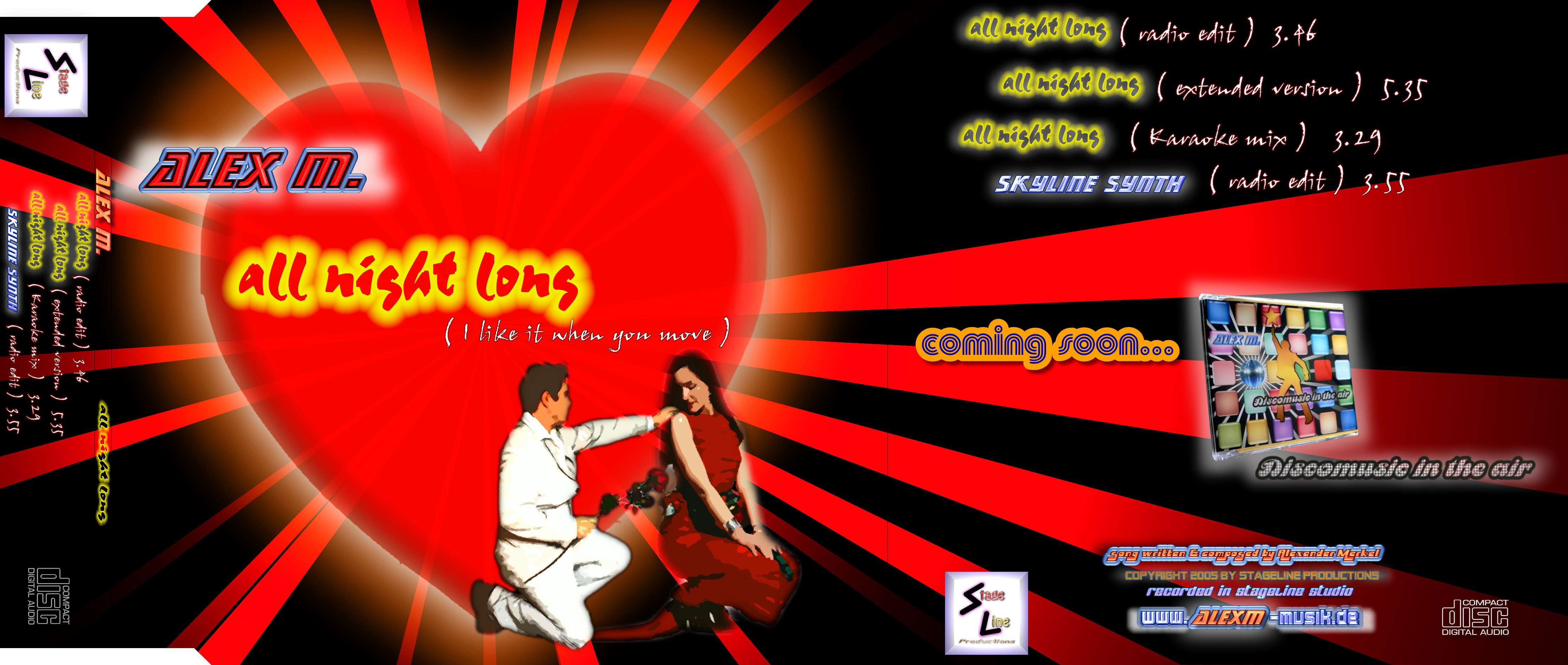 Song Download: 2005 AlexM - all night long (Radio Edit).mp3 2005 AlexM - all night long (Extended version).mp3 2005 AlexM - all night long (Karaoke Mix).mp3 2005 AlexM. - skyline synth (radio edit).mp3 Back Cover Front Cover
